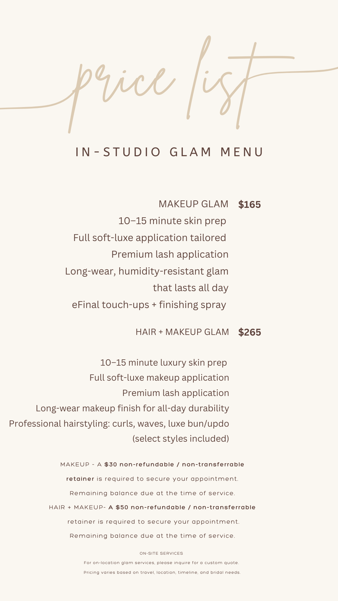 Please note that all travel accommodations, including flights, hotel stays, and any additional expenses, will be covered by the client. This ensures a seamless experience while bringing luxury glam services directly to you, no matter the destination.